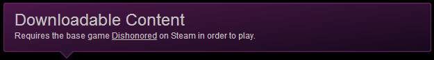 <divclass="steam-demo game-dlc-notice"> <h3>Downloadable Content</h3> <pclass="small"> Requires the base game <ahref="#">Dishonored</a> on Steam in order to play. </p> </div>