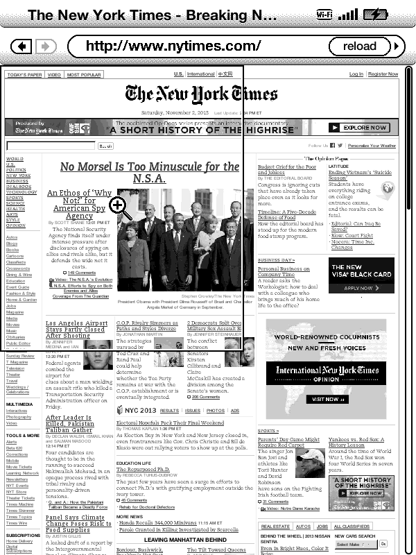 В читалке есть вайфай и, опционально, 3G. Во время выхода читалки Амазон расщедрился и сделал бесплатный 3G для читалки по всему миру, но затем ограничил доступ, оставив сайт Амазона и Википедию. По вайфаю браузер по-прежнему работает без ограничений.