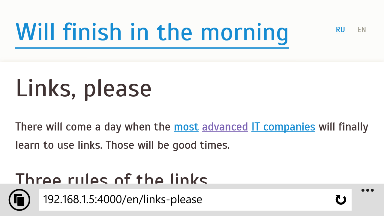 @-ms-viwport сайт адаптируетсяВ первом случае получаем поведение неоптимизированного сайта — не кайф. Во втором получается мобильная версия, закрепленная у края экрана. Кайф.